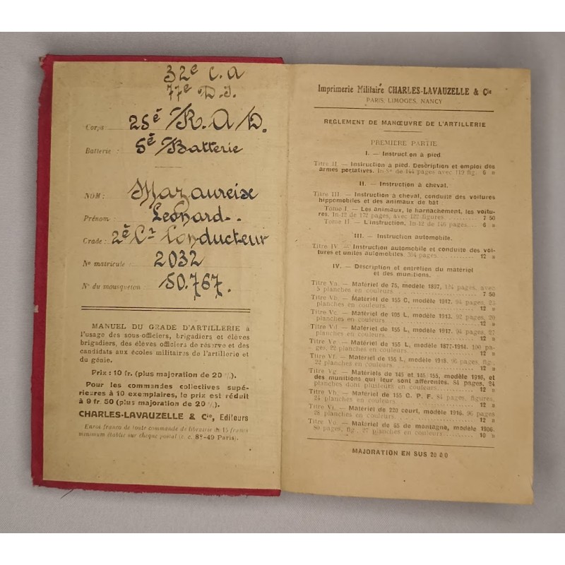 manuel instruction militaire officier artillerie batterie nominatif guerre collection